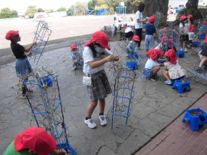 次は、この枯れたつるなどを使って、アサガオリースを作ります。