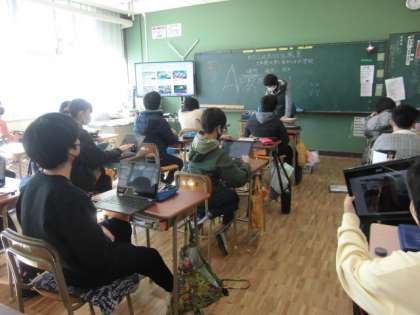 校内でも青階段、赤階段、各教室などいろいろなところの写真を撮り、教室でみんなで見合います。