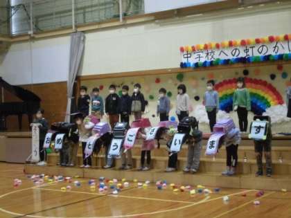 6年生を送る会の最後には、1年から5年のみんながかいたり作ったりしてくれた、心のこもった色紙のプレゼントが6年生に渡されました。