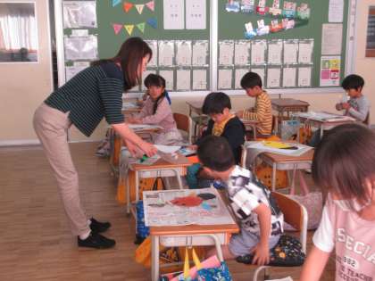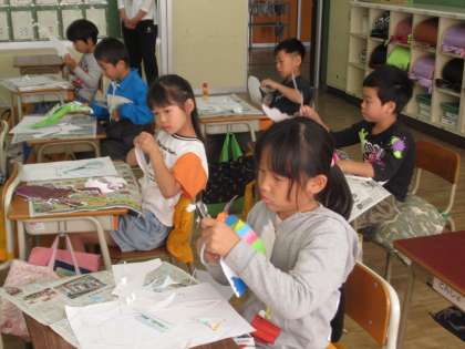 「おはなしのえ」に取り組んでいます。描いた昆虫をはさみで切っています。