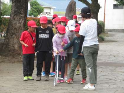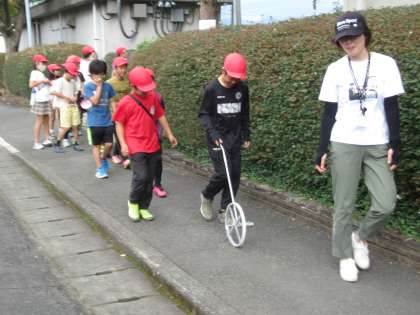 1Kmが実際にどのくらいの距離なのかを調べるため、計測器を使って調べています。