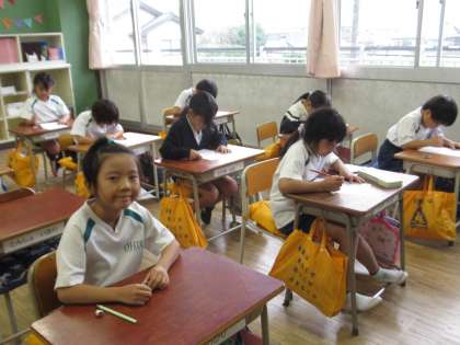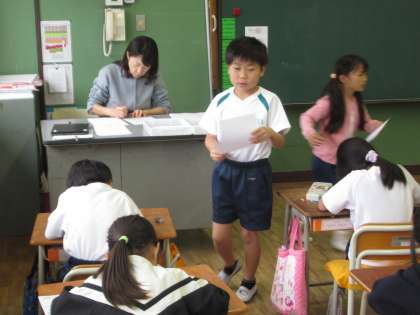 引き算の問題にチャレンジしています。早くできた人は、先生に○つけをしていただいています。