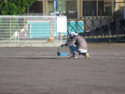 朝から用務員さんがグラウンドの草取りをしてくださっています。