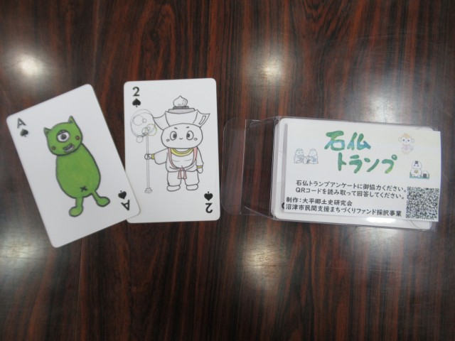 大平中を卒業し高校生になっても引き続き大平の石仏について研究し、大平郷土史研究会の皆様と一緒に石仏の紹介活動を行っている高校生2人が、作成した石仏カレンダーと石仏トランプを贈呈しに来校して下さいました。トランプには、イラスト募集に応募した児童の絵も採用されています。一番応募数の多かった3年生が全校児童を代表して受け取りました。元大平中の先生、大平郷土史研究会の方2名様、沼津市役所担当者様、沼津朝日記者様も同席して下さいました。