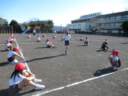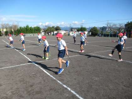 縄跳びを行っています。ペアをつくってお互いに回数を数えています。