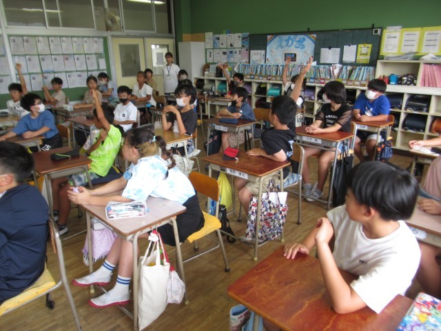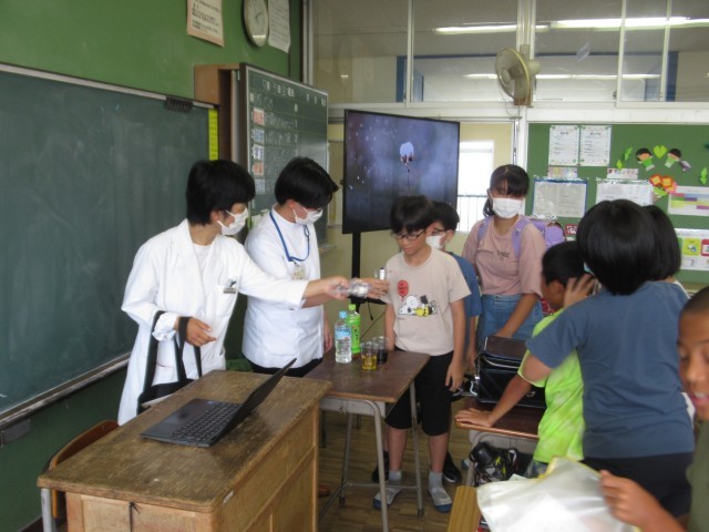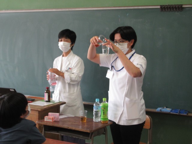 5年生対象に、薬学講座が開かれました。薬をお茶で飲むと、お茶と反応する場合があることを実験で見せてくださいました。