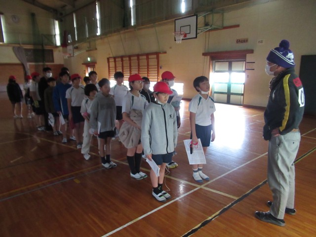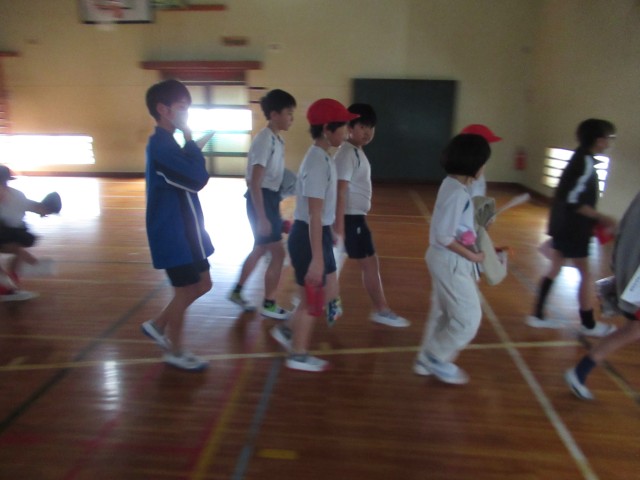 体育館で縄跳びの検定を行いました。終わって教室に戻るところでした。