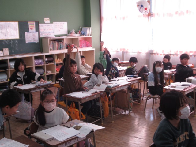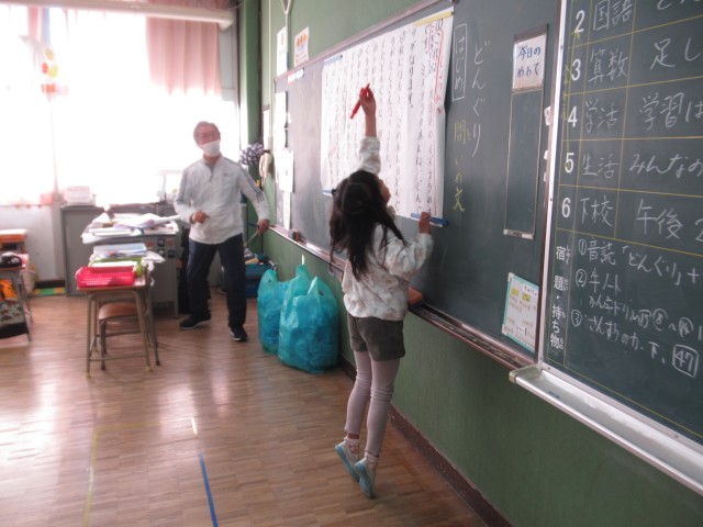 教科書の「どんぐり」を読みながら、どんぐりの特徴について発表しています。