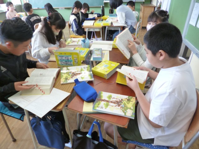 5年生国語の授業の様子です。国語辞典を引く練習をしました。友達同士で問題を出し合って、辞書を引いてみました。問題に対して、「どこかな~」「あった」「似たような言葉でおもしろい言葉があるな」と国語辞典には、たくさんの言葉が載っているおもしろさが分かりました。