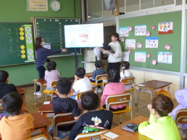 1年生、小学校生活初めての給食です。4時間目に給食のついての約束を担任の先生や栄養士の先生と確認しました。「幼稚園でやったことある」と言っている子もいました。4時間目が終わり、しっかりと手洗いをした後、給食当番の子は、給食着を着て、配膳をしました。初めてでしたが、とても上手にできました。食べ始めると「コーンチャウダー、すごくおいしい」、「ハンバーグもおいしいよ」と、どの子も笑顔いっぱいで、喜んで食べていました。