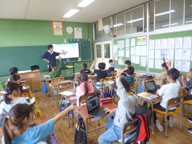 3年生社会科の授業の様子です。地図記号の学習をしました。全部で10問行いました。クイズは3択形式でした。「たんぼ」、「お寺」、「神社」、「茶畑」、「果樹園」、「城跡」などとだんだんと問題が難しくなっていきましたが、子どもたちはよく答えることができました。
