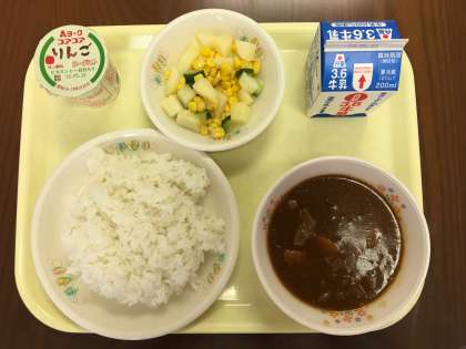 ハヤシライス、ポテトサラダ、りんごヨーグルトです。ハヤシライスはルーがよく煮込まれていておいしかったです。