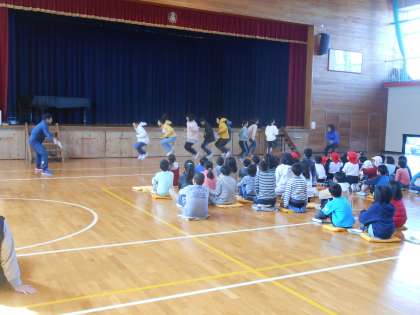 大なわとび100回にチャレンジ。その後、全員でワカメダンス。