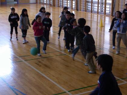体育館でドッジボールです。40名の第一小の3年生と11名の西浦小の3年生が二手に分かれ、対戦しました。