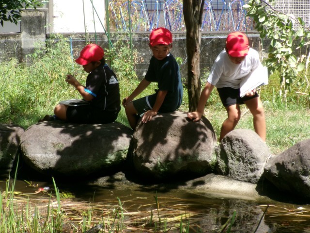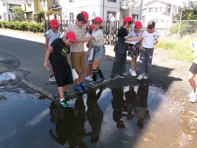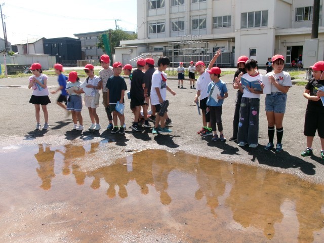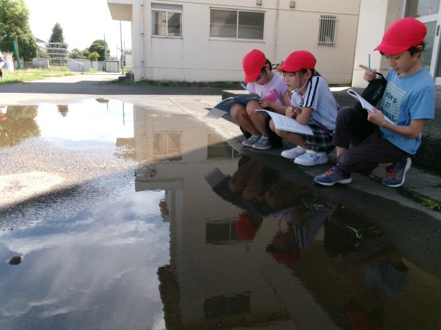 4年2組の理科の授業の様子です。「雨水のゆくえ」の学習です。今朝の大雨とその後の晴れた天気はいい観察のチャンスです。