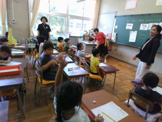 1年生は言語科英語で、体の名前を教えてもらいました。ALTの発音を真似て、一生懸命発音しています。ゲームでは楽しみながら英語を使って話していました。