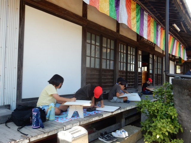 お寺の建物を描いた人、釣り鐘を描く人、松蔭寺の門を描く人等まちまちですが、自分の心を動かされた場所からスケッチをしました。