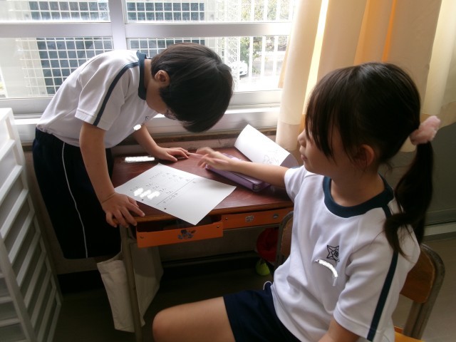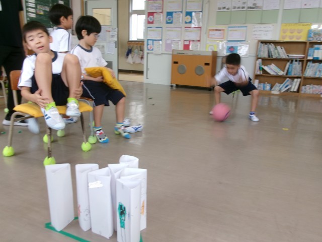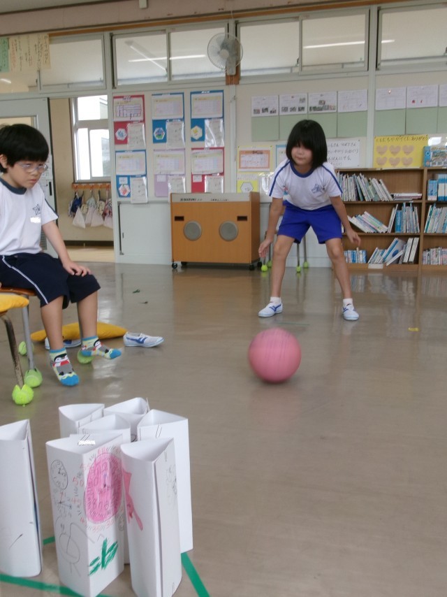 なかよし学級の授業の様子です。自分たちでピンを作り、ボーリング遊びをしています。得点集計も頑張っています。
