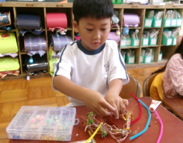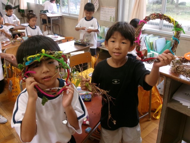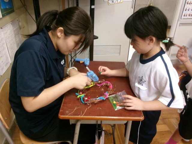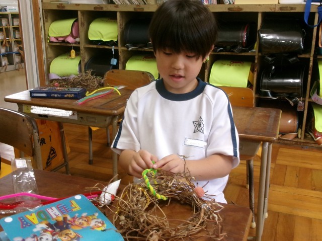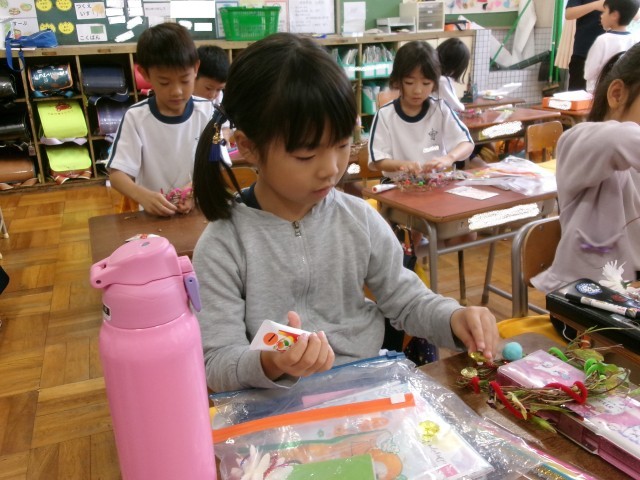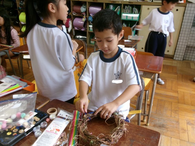 1年2組の生活科の様子です。朝顔のつるで作ったリースに飾りをつけていました。