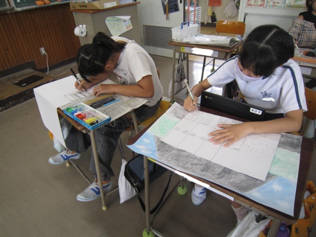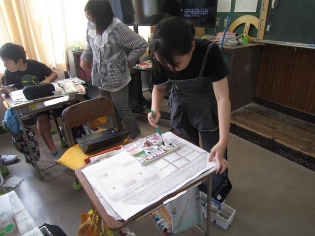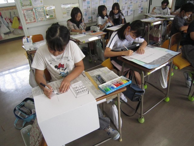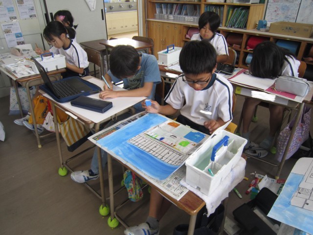 4年2組の図工の授業の様子です。「未来の原」の作品を一生懸命に制作していました。