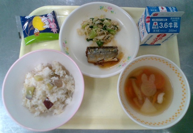 十五夜いもごはん 牛乳 さんまの生姜煮 キャベツのごま和え 具だくさん汁