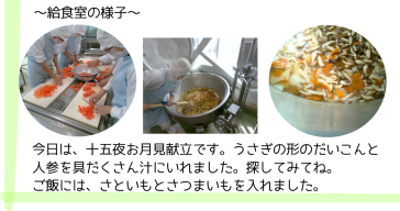 今日は、十五夜に合わせて、お月見献立です。十五夜は、別名「芋名月」といわれます。