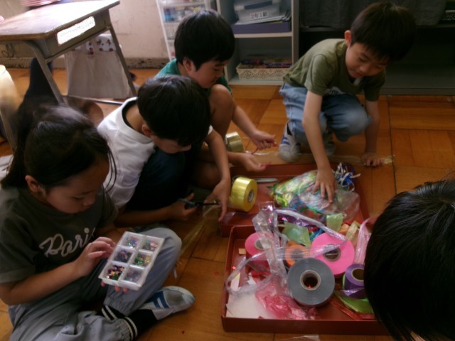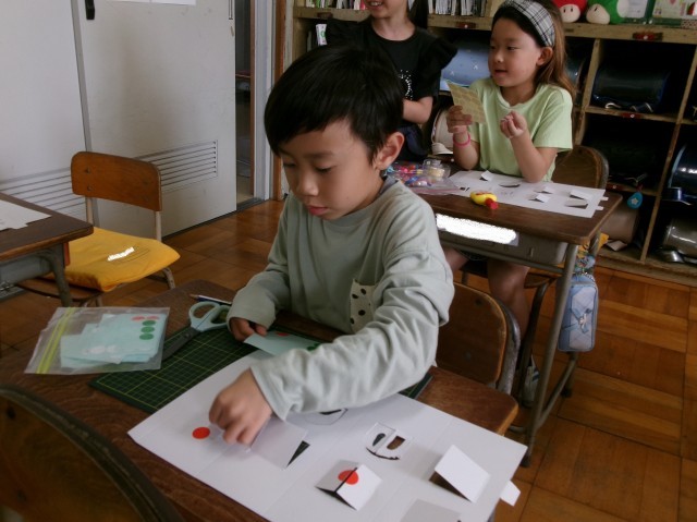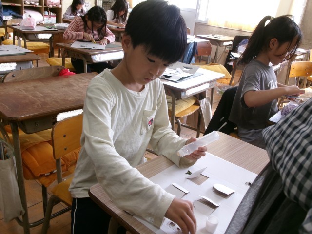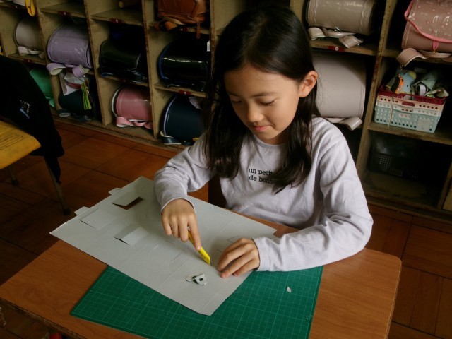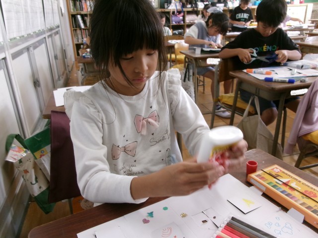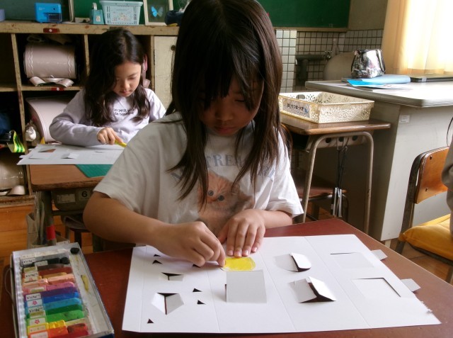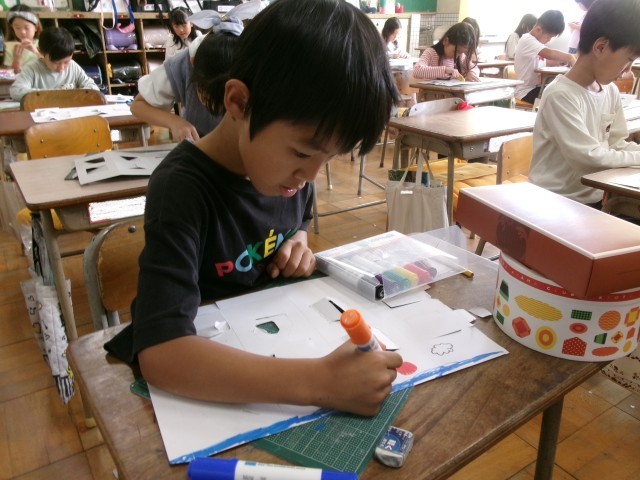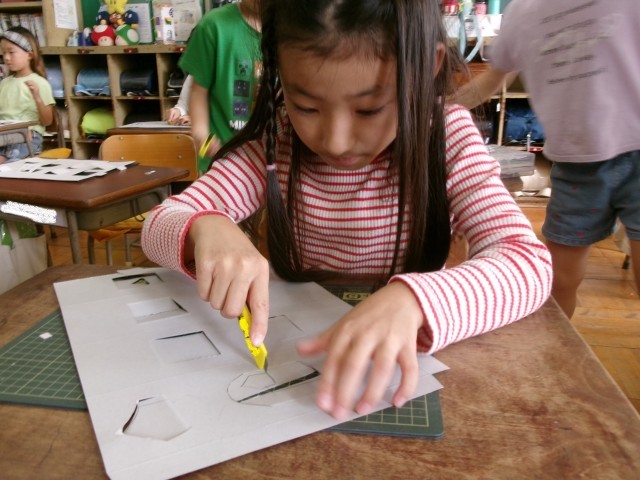2年1組の図工「まどをあけたら」の様子です。カッターを上手に使って窓を作っています。