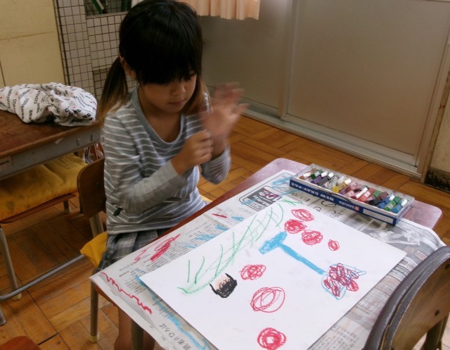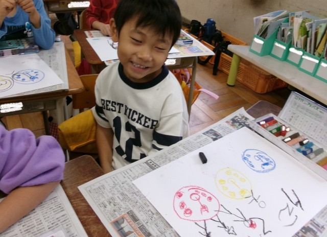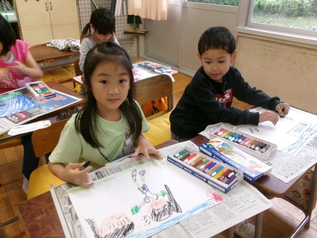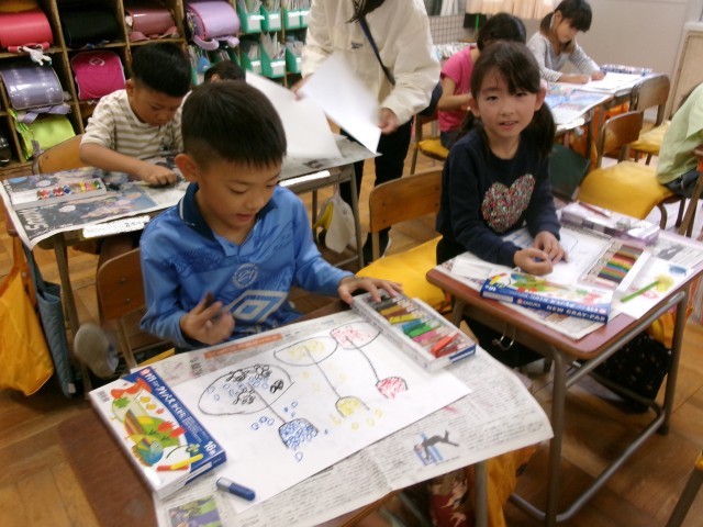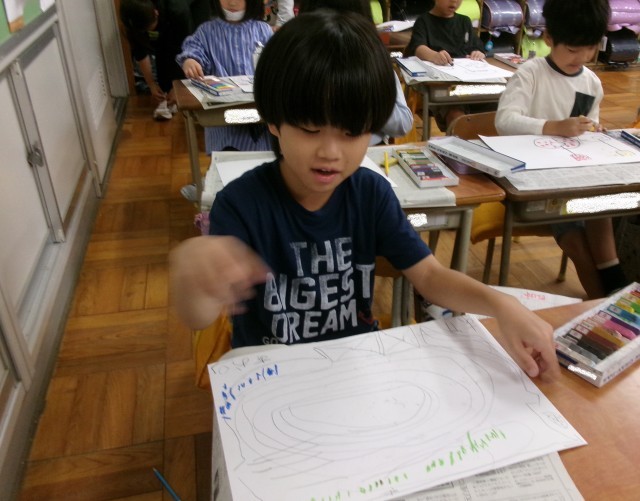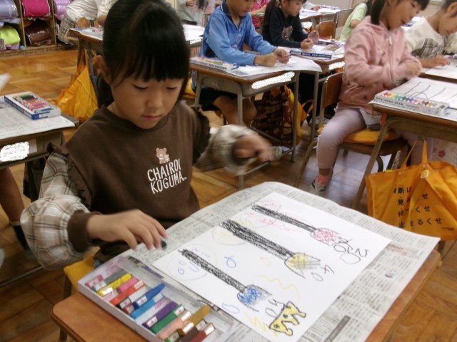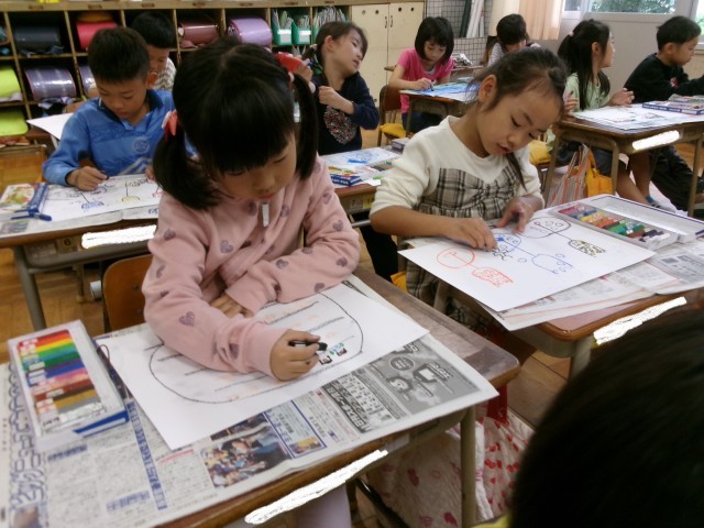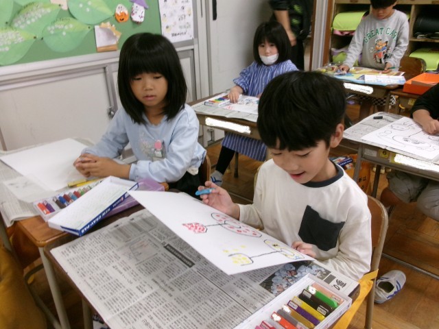 1年2組の図工の授業の様子です。運動会の絵を描いています。