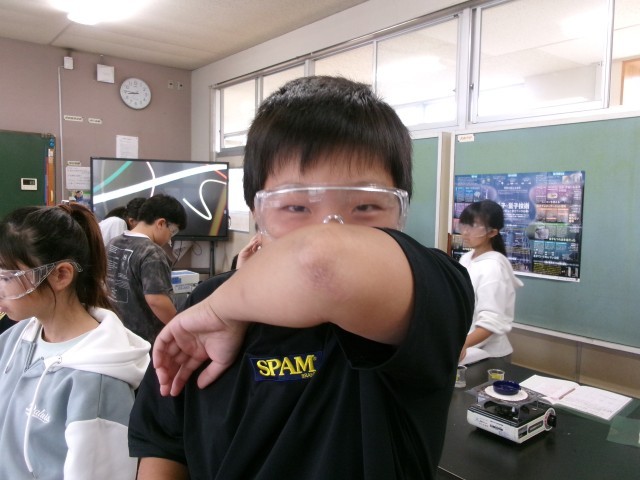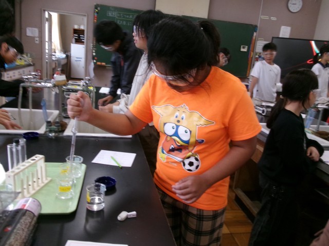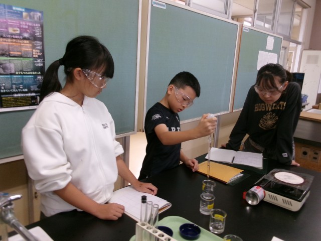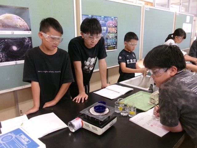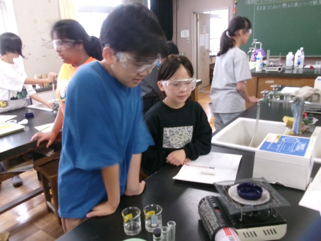 6年3組の理科「水溶液の性質」の授業の様子です。無色透明な水溶液を蒸発させて違いを比べています。