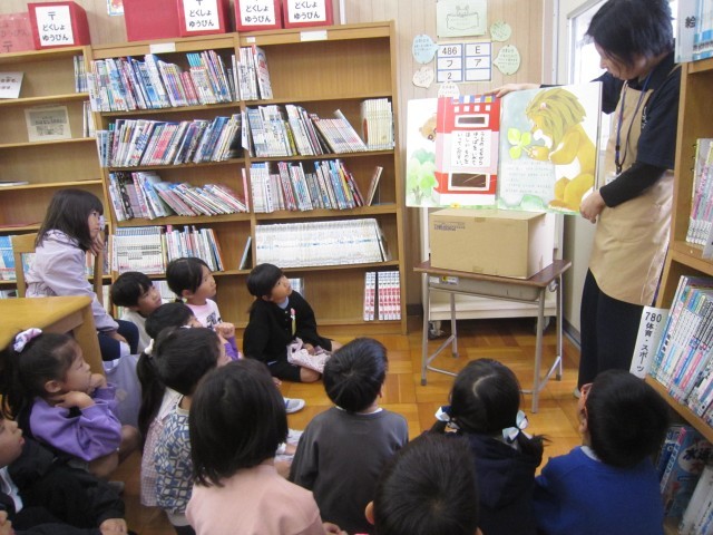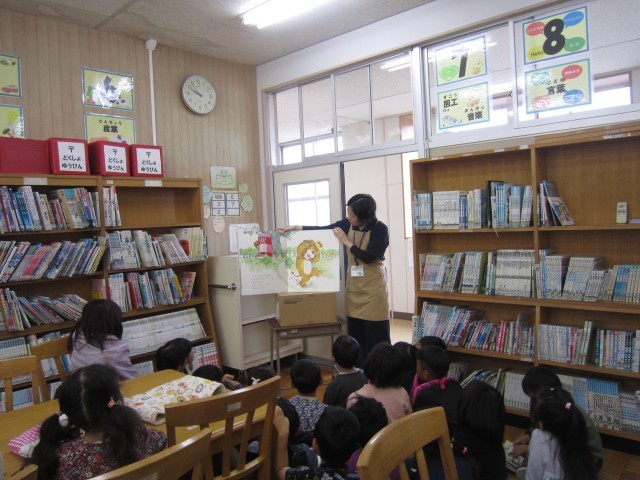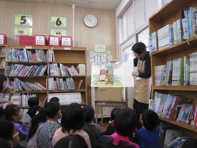 1年2組、図書館で司書の先生に大きな絵本の読み聞かせをしてもらいました。