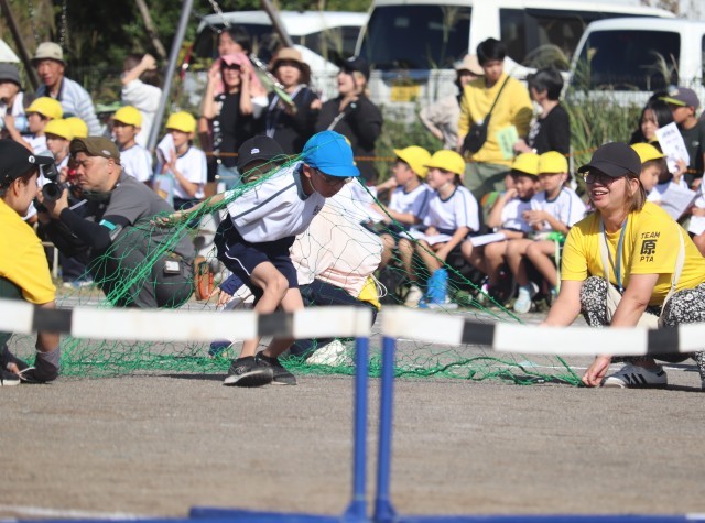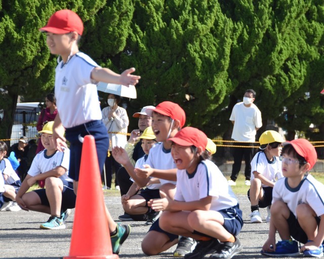 3年生の団競「わたって、くぐって、とびこえろ!原の子たんけんたい!」の様子です。1位赤組、2位黄組、3位青組でした。