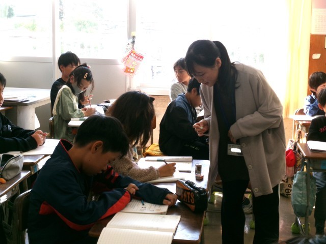 4年3組には教育実習生が来ています。今日は算数の授業です。