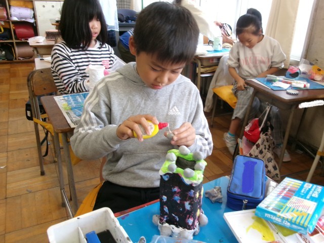 3年1組の図工の授業の様子です。空き容器と紙粘土を使って小物入れを作っています。