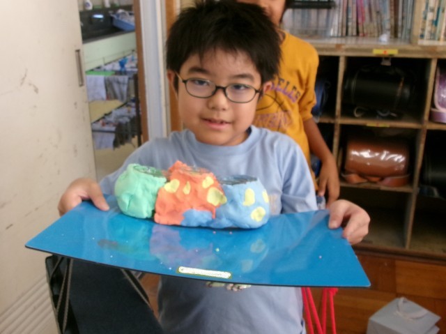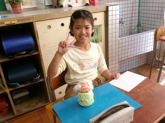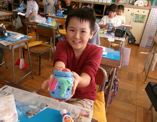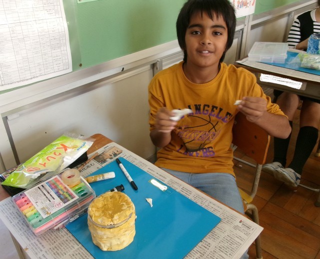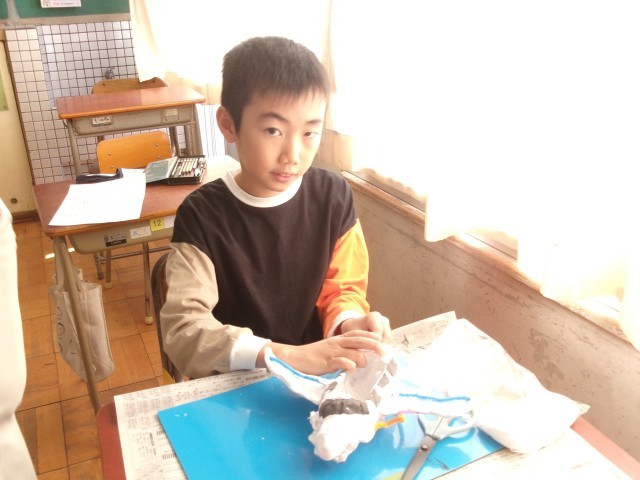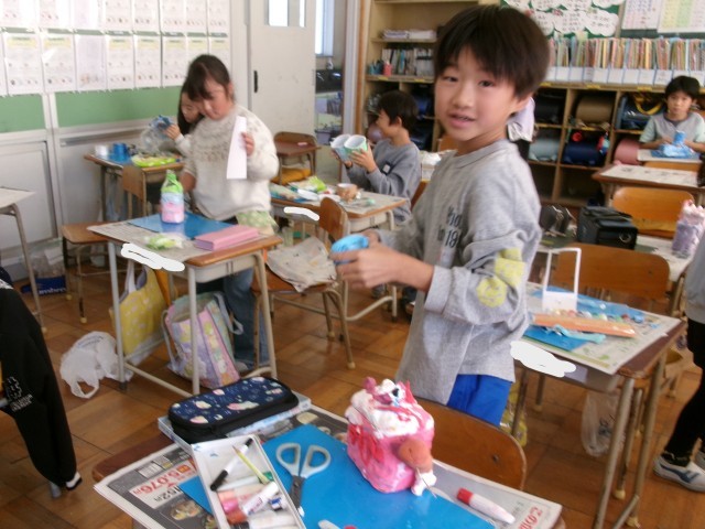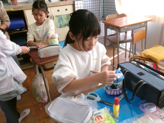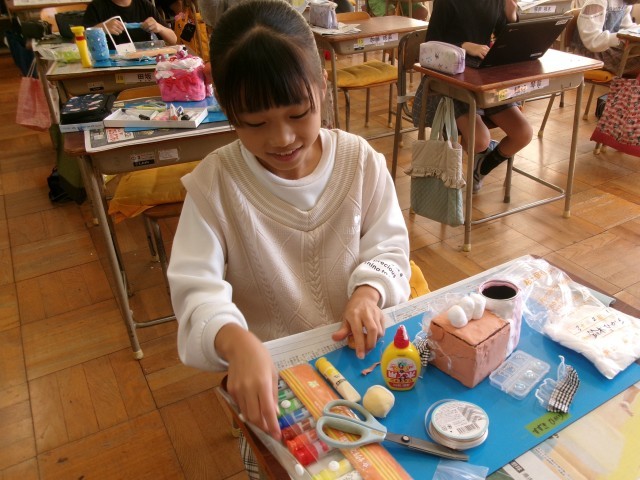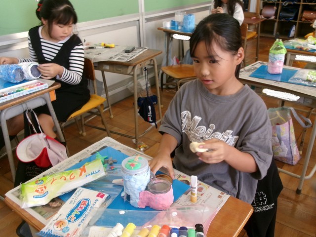 3年1組の図工の授業の様子です。空き容器と紙粘土を使って小物入れを作っています。