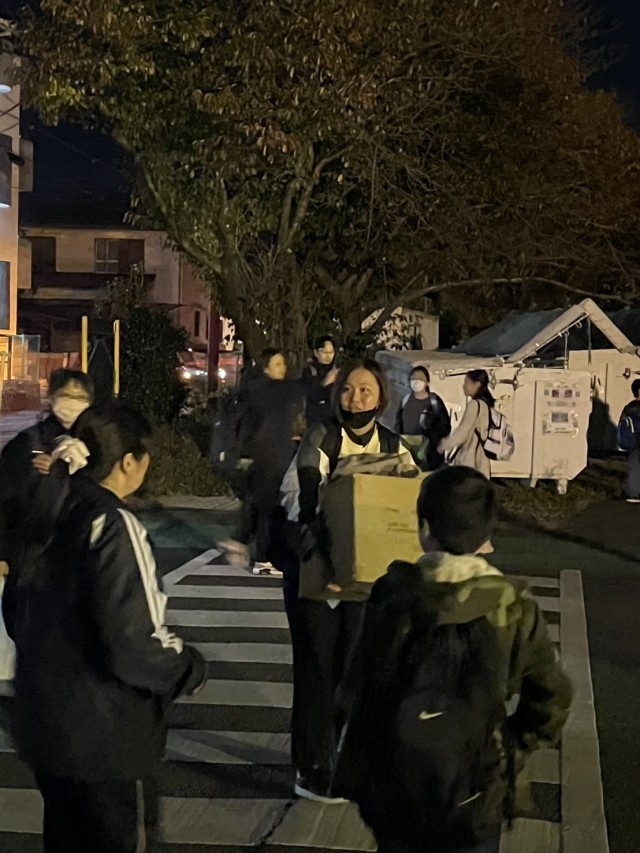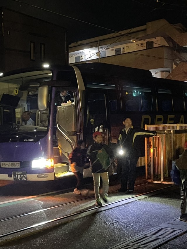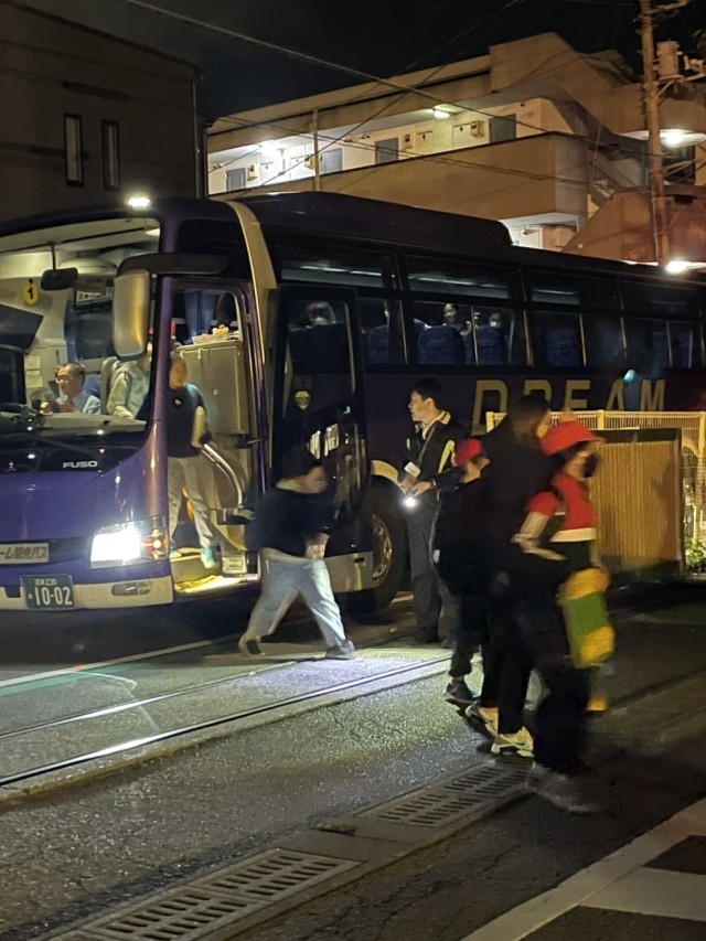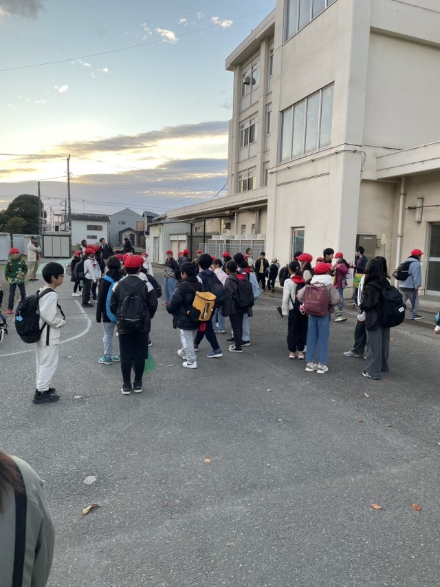 帰りは学校から逐一連絡をいただき、各バス停で保護者がお迎えする形となりました。どうしてもお迎えが間に合わなかった子どもたちは、学校でバスを降りた後、安全に保護者と帰宅することができました。11月ということもあり、学校に到着した頃には外がすっかり暗くなっていましたが、教頭先生が懐中電灯で足元を照らしてくださり、子どもたちは安心してバスを降りることができました。