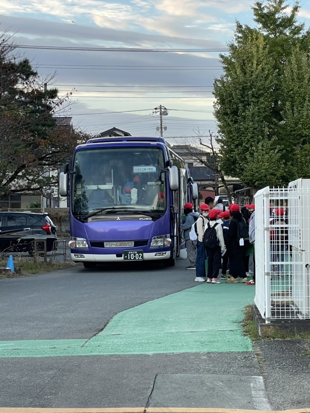 バス乗車の際には、1号車は赤白帽の赤、2号車は白と色分けをし、先生方にも子どもたちにも分かりやすい形で整然と乗り込むことができました。出発の際には、校長先生や教頭先生が「いってらっしゃい、楽しんできてね」と笑顔で見送り、子どもたちも元気に「行ってきます!」と手を振りながら学校を後にしました。