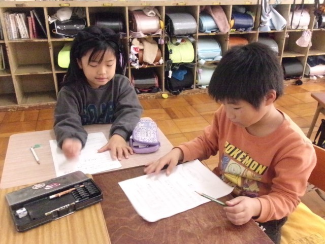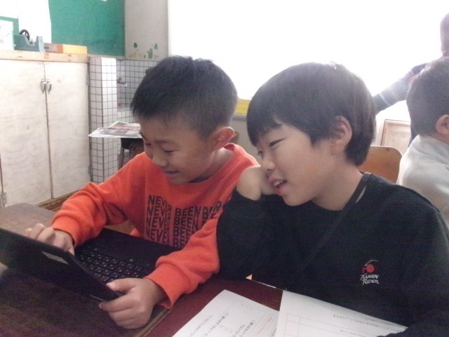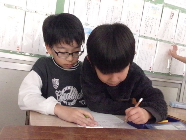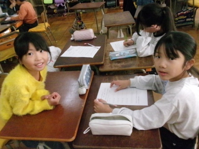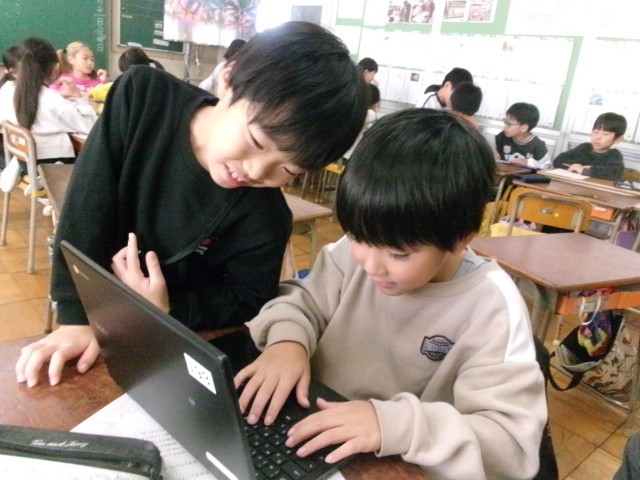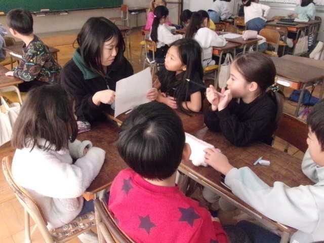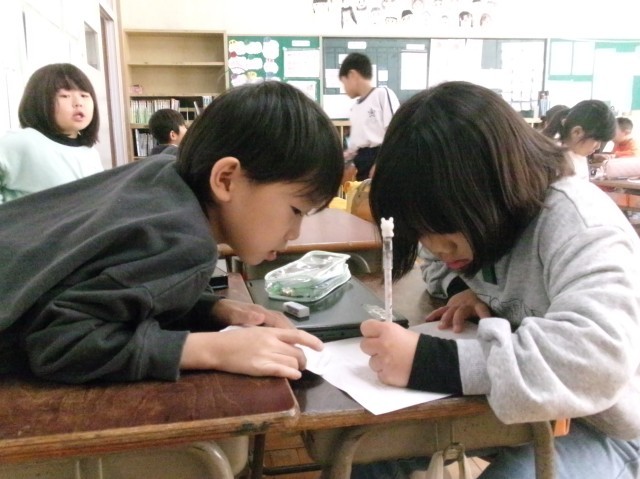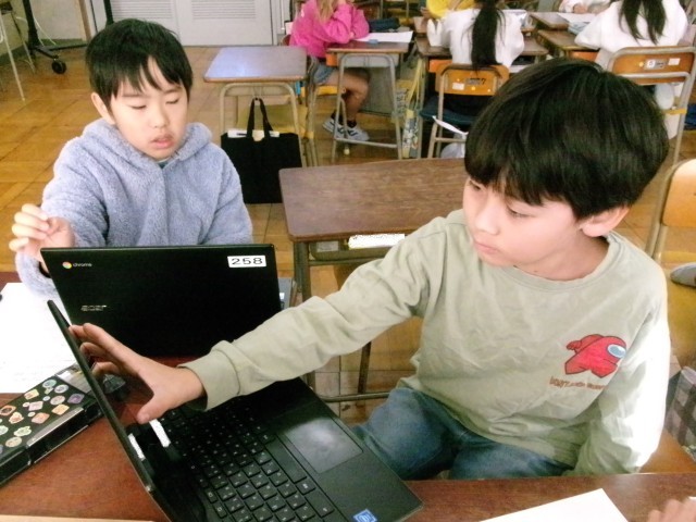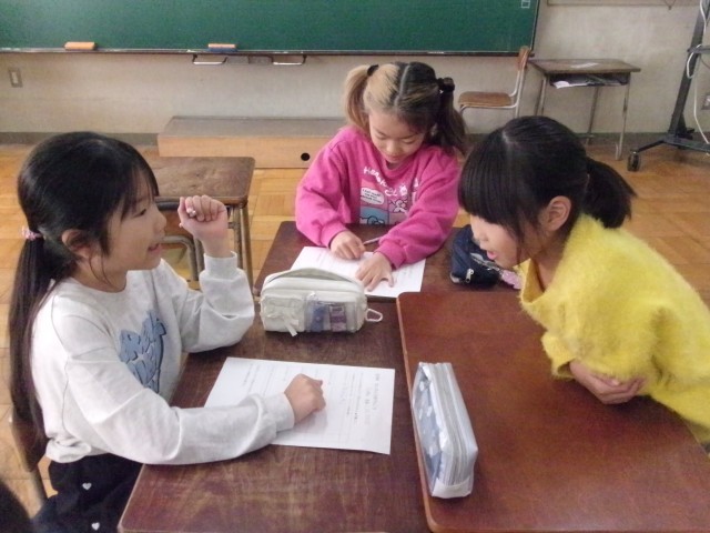2年2組の生活科の授業の様子です。町たんけんに行って調べたことを発表するためにグループで楽しそうに話し合っています。