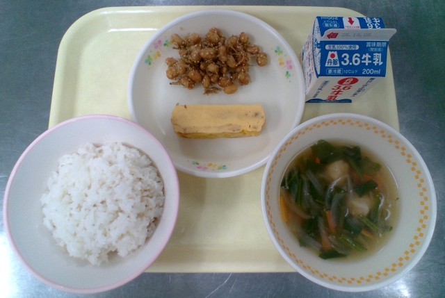 ごはん 牛乳 かつお入り厚焼きたまご 大豆とじゃこの甘辛揚げ 肉団子スープ