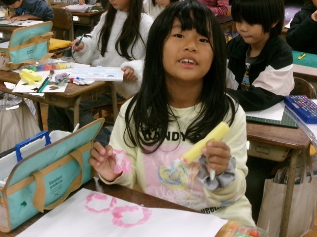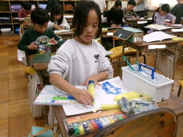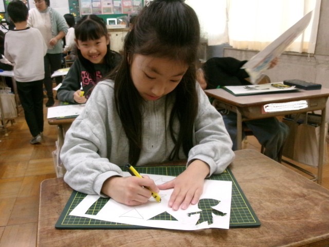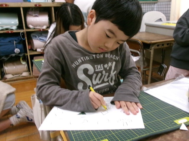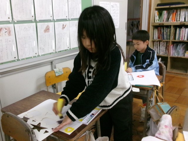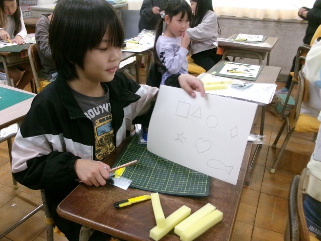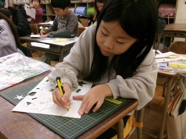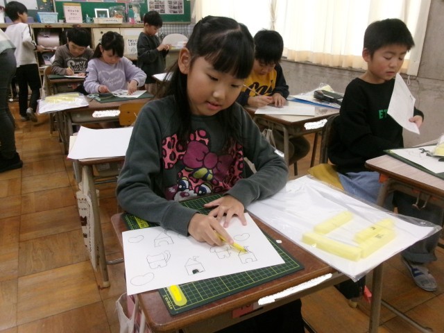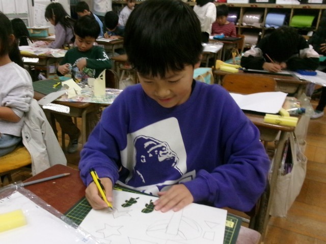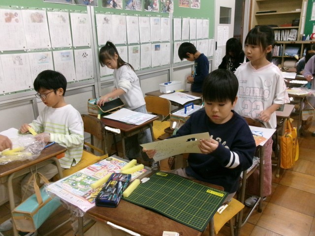 2年1組の図工の授業の様子です。カッターを上手に使って作品を作っています。