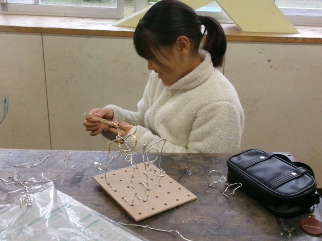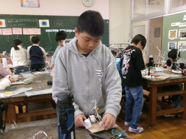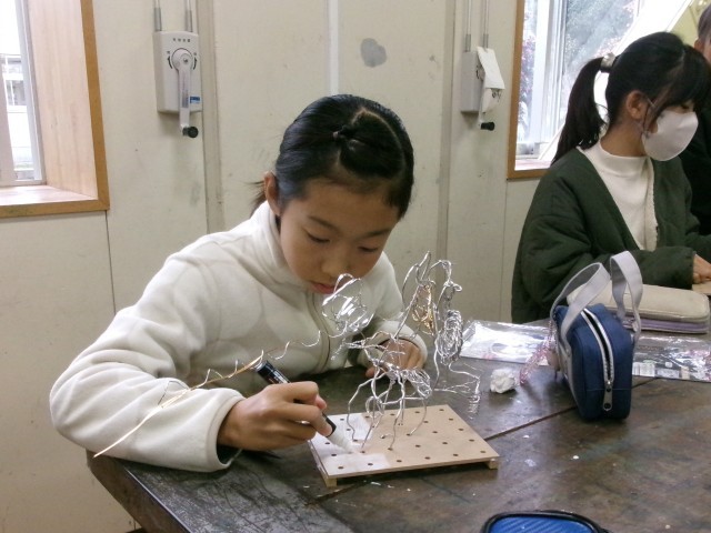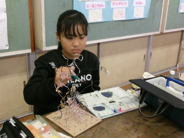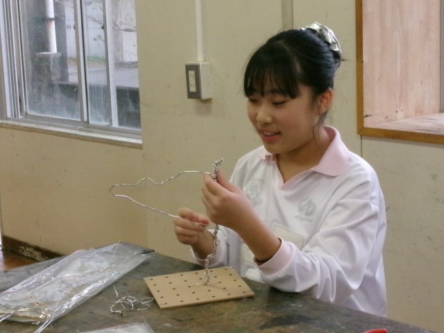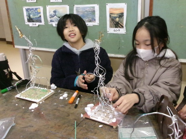 5年3組の図工の授業の様子です。針金を使って立体作品を作っています。