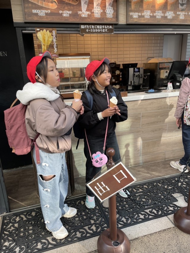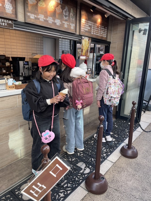 自分たちで作成したスケジュールを確認しながら仲間とバスを待つ姿。道に迷いながらも相談し、協力し合う姿。取材を終えた後、達成感に満ちた笑顔でアイスクリームを食べている姿。そして何より、アポイント先でオーナーや担当の方に、調べてきた内容をもとに堂々と質問し、その場で新たな情報を聞きながら積極的にやりとりをする姿は、授業参観や家庭で見る姿とは全く違い、頼もしさと力強さにあふれていました。
