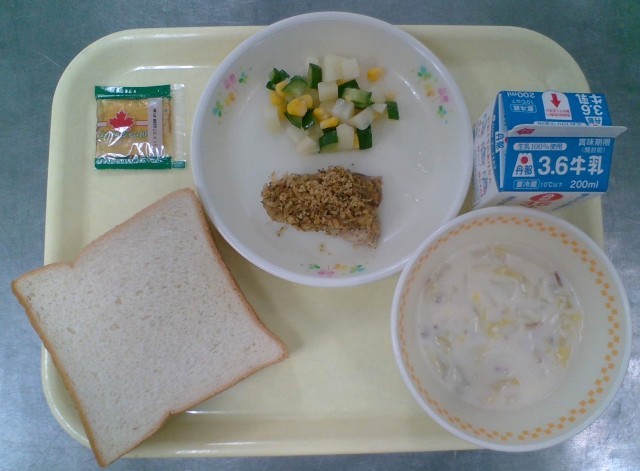 食パン メイプルジャム 牛乳 鶏肉の香草パン粉焼き マセドアンサラダ