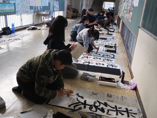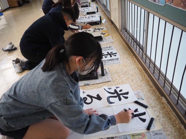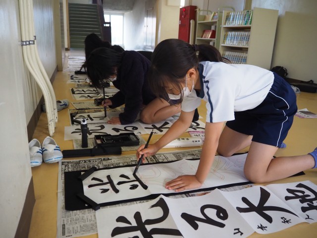 今年は「光る大地」です。1,2学期の書写で学んだ、点画のつながりと字形を思い出して書きました。