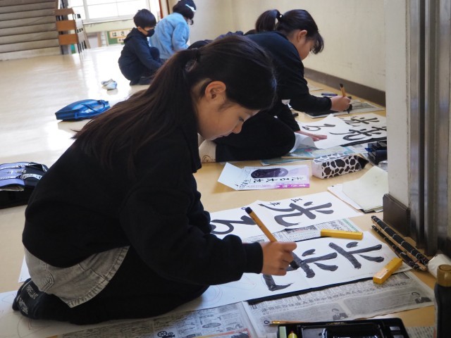 みんなで書き初めの由来を確認し、練習をしました。