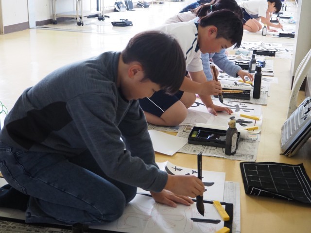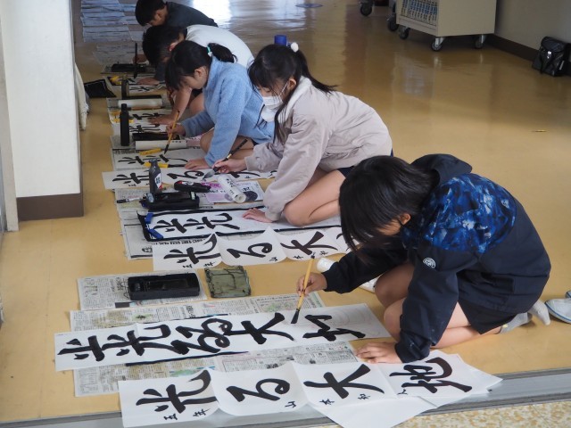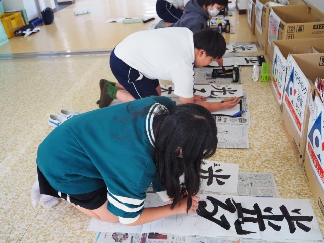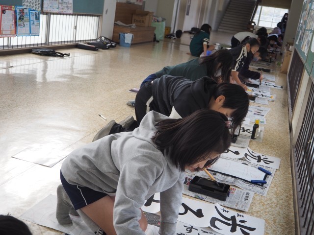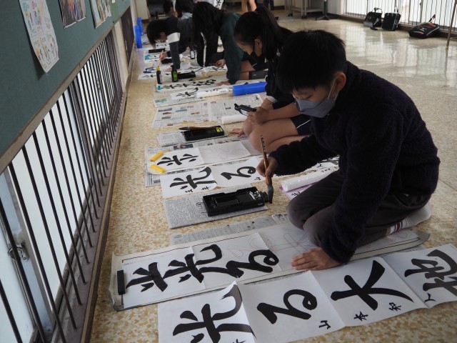 今年は「光る大地」です。1,2学期の書写で学んだ、点画のつながりと字形を思い出して書きました。
