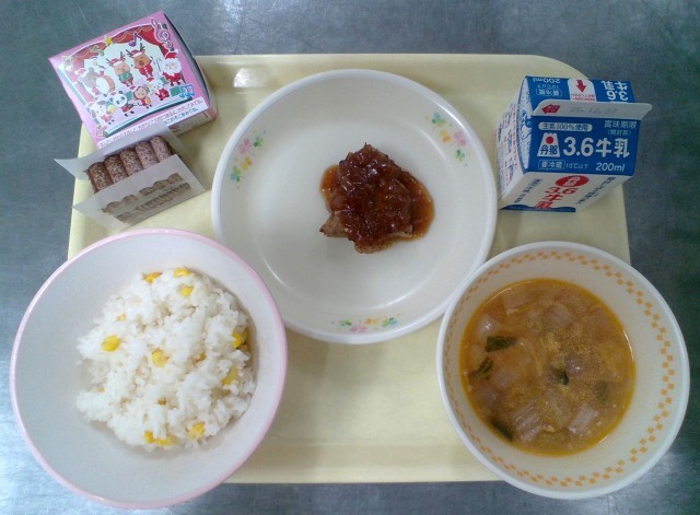 コーンライス 牛乳 ハンバーグの玉ねぎソースがけ ミネストローネスープ おたのしみデザート