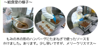 今日は、2学期最後の給食でした。もみの木の形をしたハンバーグです。