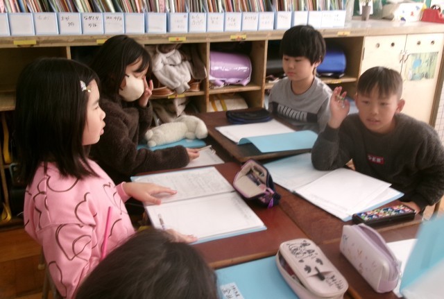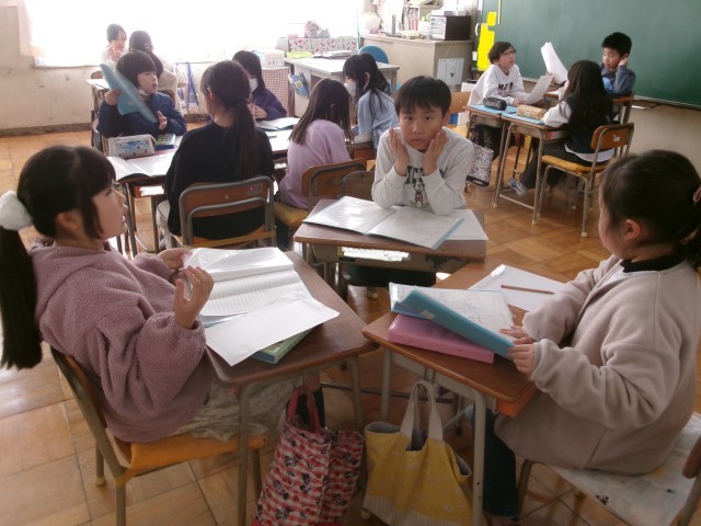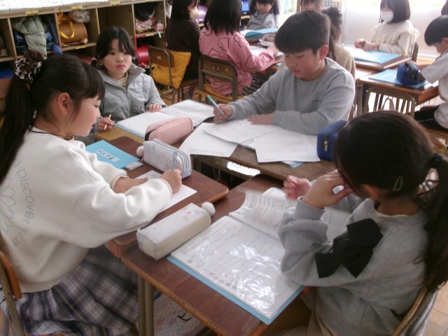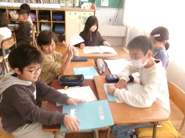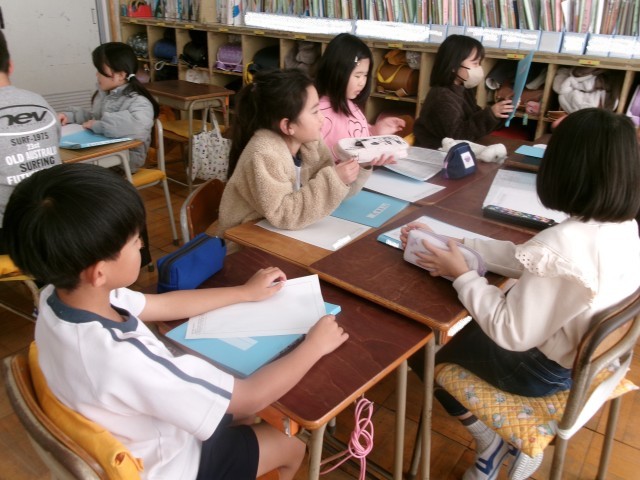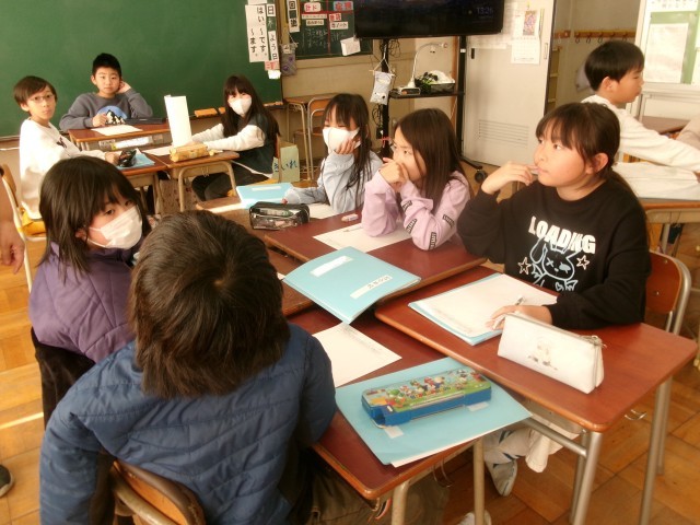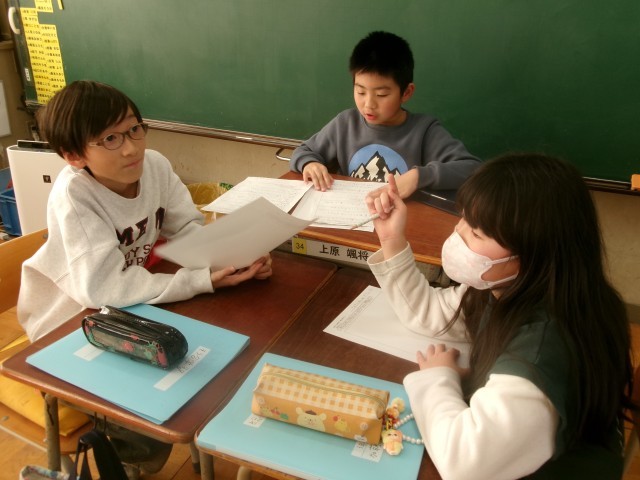 3年生の総合の授業の様子です。2クラスを分解し、2学期に取材に行ったグループでまとめ方について相談しています。