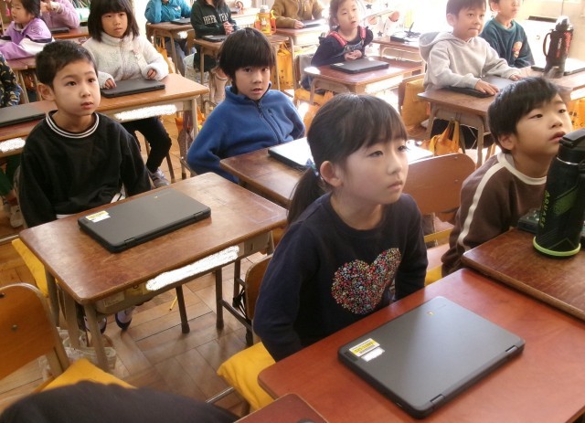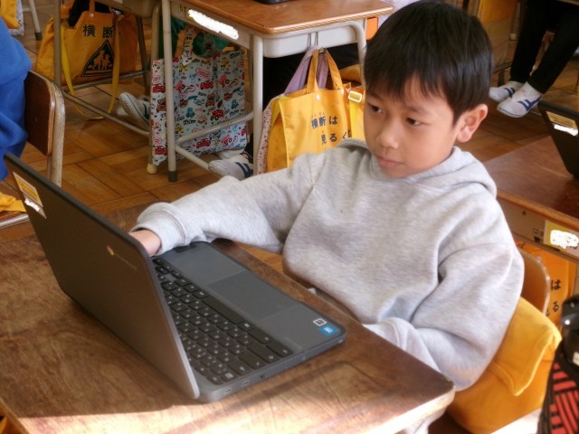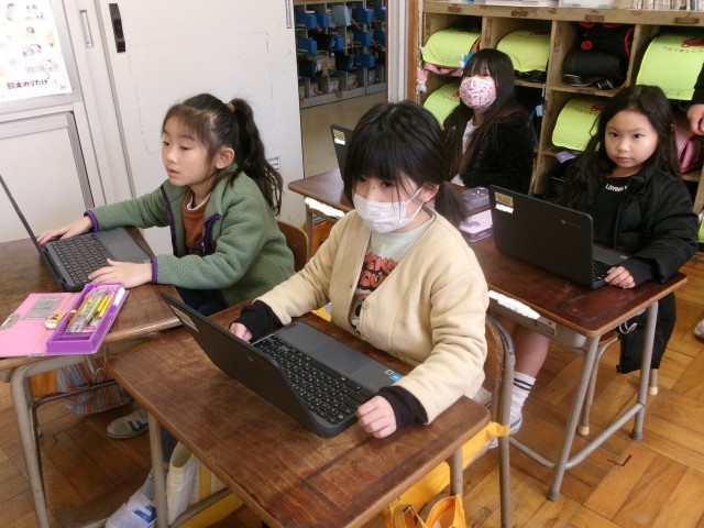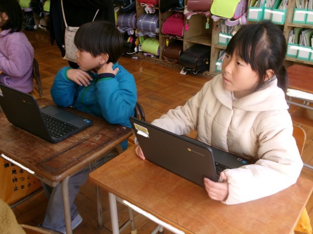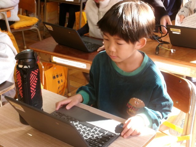 1年生にも新しいパソコンが貸し出されました。1年2組は一斉にログインして、動作を確認しています。