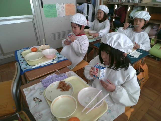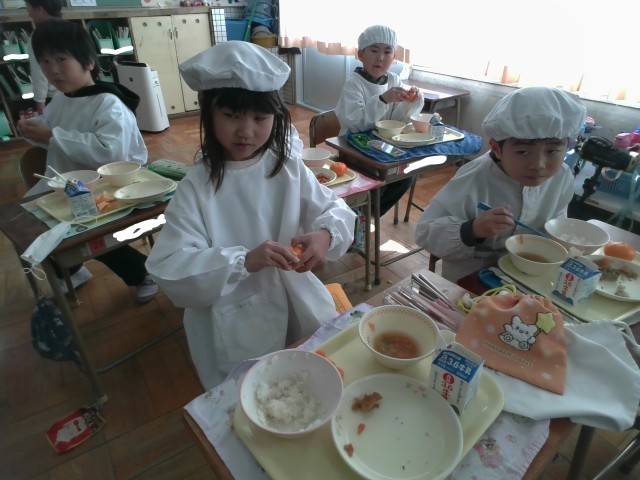 今日から3学期の給食が始まりました。お正月メニューにみかんもついて、1年生はおいしそうに食べていました。